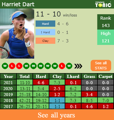 Dart has a winning match record in the last 7 years having won 57% of her matches (221-165). 7-3 on clay in 2021. Regarding her performance on the same surface of this competition, Dart has a composed18-17 record in the last 7 years on clay.
