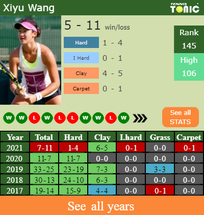 Wang has a winning record in the last 6 years having won 59% of her matches (108-76). 6-5 on clay in 2021. In connection with her performance on the same surface of this competition, Wang has an aggregate29-17 match record in the last 6 years on clay.
