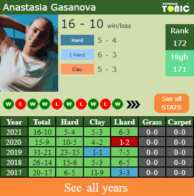 Gasanova has a solid match record in the last 7 years having won 63% of her matches (163-96). 5-3 on clay in 2021. Talking about her performance on the same surface of this competition, Gasanova has an overall44-25 match record in the last 7 years on clay.