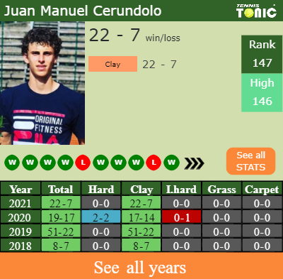 Manuel Cerundolo has a composed 22-7 win-loss record in 2021, 22-7 on clay (See FULL STATS).