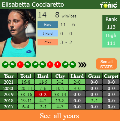 Cocciaretto has a solid win-loss record in the last 5 years having won 66% of her matches (99-50). 3-2 on clay in 2021. In connection with her performance on the same surface of this competition, Cocciaretto has an overall68-32 record in the last 5 years on clay.