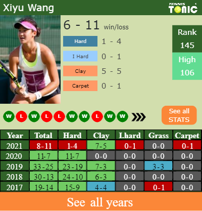 Wang has a composed 8-11 win-loss record in 2021, 7-5 on clay (See FULL STATS).