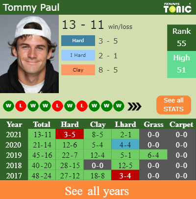 Paul has a composed 13-11 win-loss record in 2021, 8-5 on clay (See FULL STATS).