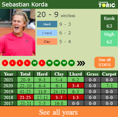 Korda has a compiled 20-9 win-loss record in 2021, 5-4 on clay (See FULL STATS).