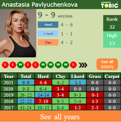 Talking about her overall career, Anastasia has an overall 467-307 record. She has a positive 100-72 record on clay.