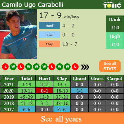 Ugo Carabelli has an overall 17-9 win-loss record in 2021, 13-7 on clay (See FULL STATS).