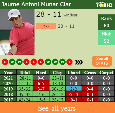 Munar Clar has a compiled 28-11 win-loss record in 2021, 28-11 on clay (See FULL STATS).