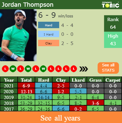 Jordan has a compiled 6-9 win-loss record in 2021, 2-5 on clay (See FULL STATS).
