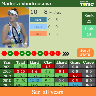 Vondrousova has a compiled 10-8 win-loss record in 2021, 1-3 on clay (See FULL STATS).