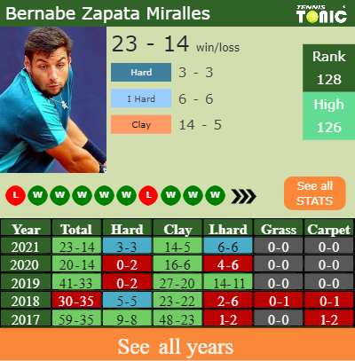 Zapata Miralles has an overall 23-14 win-loss record in 2021, 14-5 on clay (See FULL STATS).