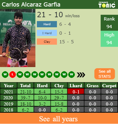 Alcaraz Garfia has a fantastic match record in the last 4 years having won 74% of his matches (84-29). 15-5 on clay in 2021. In connection with his performance on the same surface of this event, Alcaraz Garfia has a composed65-22 match record in the last 4 years on clay.