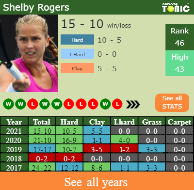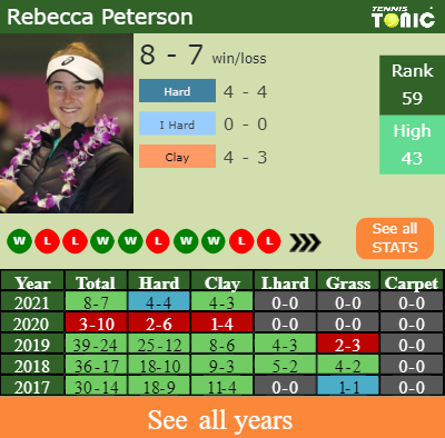 This will be the 2nd time that Shelby Rogers and Rebecca Peterson square off. The head to head is 1-0 for Rogers (see full H2H stats), but they have never competed against each other on clay.
