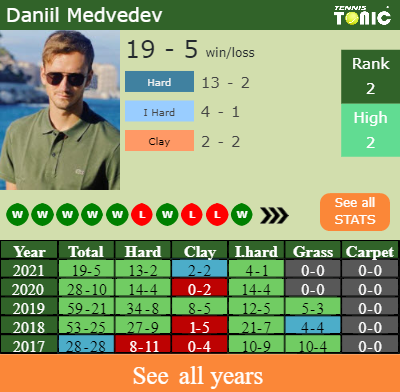 Medvedev has a composed 19-5 win-loss record in 2021, 2-2 on clay (See FULL STATS).
