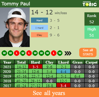 The American has an overall 14-12 win-loss record in 2021, 9-6 on clay (See FULL STATS).