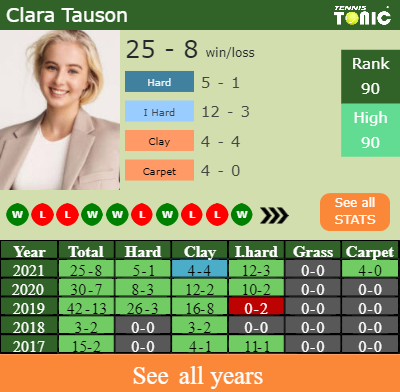 Tauson has an overall 25-8 win-loss record in 2021, 4-4 on clay (See FULL STATS).