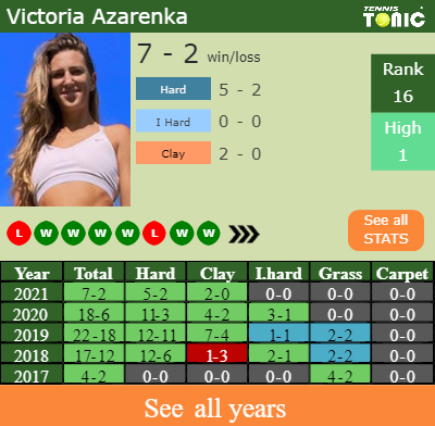 The Belarussian has an overall 7-2 win-loss record in 2021, 2-0 on clay (See FULL STATS).