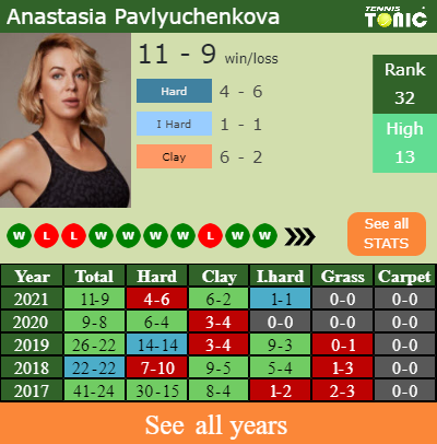 Anastasia has a composed 11-9 win-loss record in 2021, 6-2 on clay (See FULL STATS).