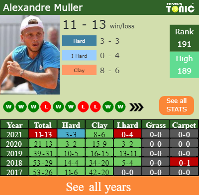Muller has an aggregate 11-13 win-loss record in 2021, 8-6 on clay (See FULL STATS).