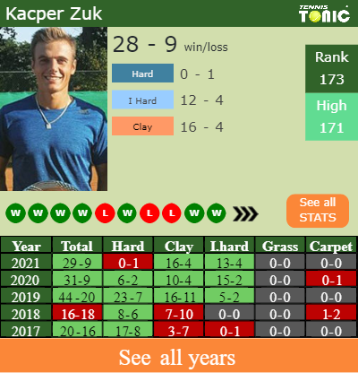 Zuk has a solid match record in the last 6 years having won 65% of his matches (151-83). 16-4 on clay in 2021. In connection with his performance on the same surface of this event, Zuk has an aggregate55-40 win-loss record in the last 6 years on clay.