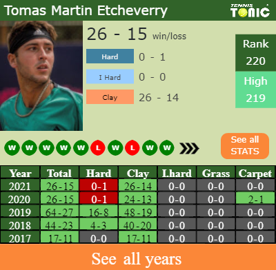 The Argentine has an aggregate 26-15 win-loss record in 2021, 26-14 on clay (See FULL STATS).