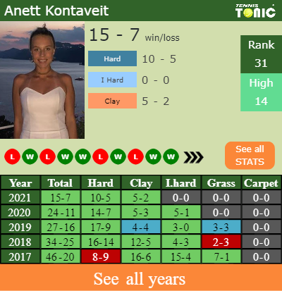 Anett has a composed 15-7 win-loss record in 2021, 5-2 on clay (See FULL STATS).