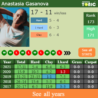 Gasanova has an overall 17-11 win-loss record in 2021, 0-0 on grass (See FULL STATS).