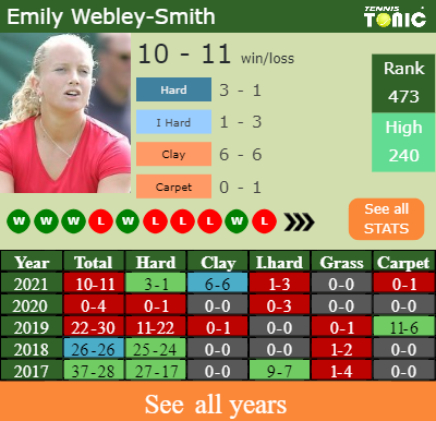In terms of her career, Emily has an overall 345-394 record. She has a negative 28-60 record on grass.
