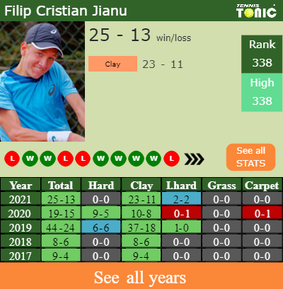 Cristian Jianu has a compiled 25-13 win-loss record in 2021, 23-11 on clay (See FULL STATS).