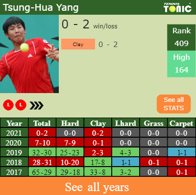 In terms of his career, Tsung-Hua has an overall 467-358 record. He has a positive 111-69 record on clay.