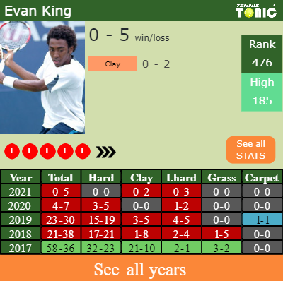 Evan has an overall 0-5 win-loss record in 2021, 0-2 on clay (See FULL STATS).