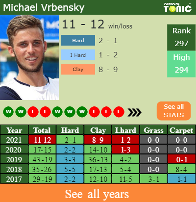 Vrbensky has an overall 11-12 win-loss record in 2021, 8-9 on clay (See FULL STATS).