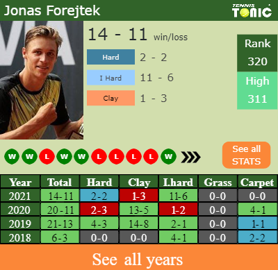 Forejtek has a compiled 14-11 win-loss record in 2021, 1-3 on clay (See FULL STATS).