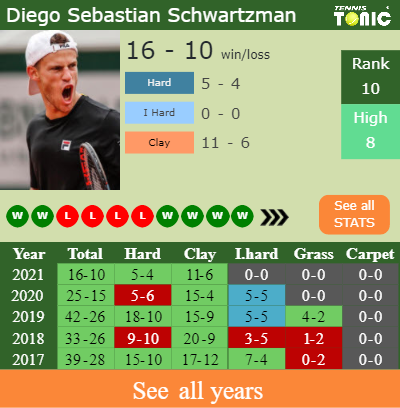 Diego has an aggregate 16-10 win-loss record in 2021, 11-6 on clay (See FULL STATS).