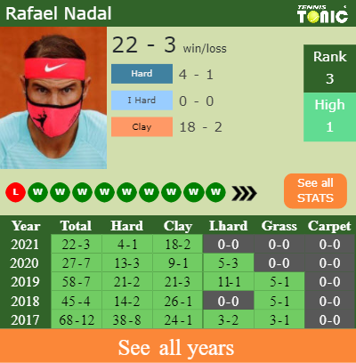 Nadal has a compiled 22-3 win-loss record in 2021, 18-2 on clay (See FULL STATS).