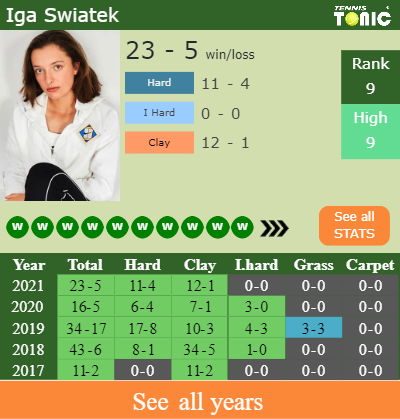 Swiatek has an overall 23-5 win-loss record in 2021, 12-1 on clay (See FULL STATS).