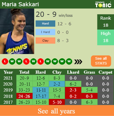 Sakkari has a compiled 20-9 win-loss record in 2021, 8-3 on clay (See FULL STATS).