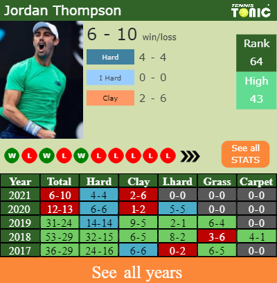 The Australian has a compiled 6-10 win-loss record in 2021, 0-0 on grass (See FULL STATS).