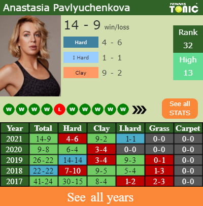 Pavlyuchenkova has a compiled 14-9 win-loss record in 2021, 9-2 on clay (See FULL STATS).