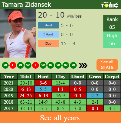 Zidansek has a composed 20-10 win-loss record in 2021, 15-4 on clay (See FULL STATS).