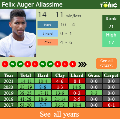 Auger-Aliassime has an aggregate 14-11 win-loss record in 2021, 0-0 on grass (See FULL STATS).