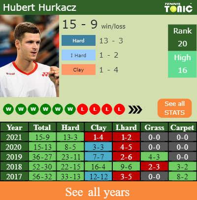 Hurkacz has an aggregate 15-9 win-loss record in 2021, 0-0 on grass (See FULL STATS).