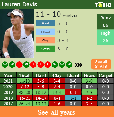 Davis has an aggregate 11-10 win-loss record in 2021, 3-0 on grass (See FULL STATS).