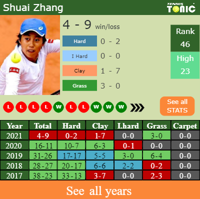 Shuai has an aggregate 4-9 win-loss record in 2021, 3-0 on grass (See FULL STATS).
