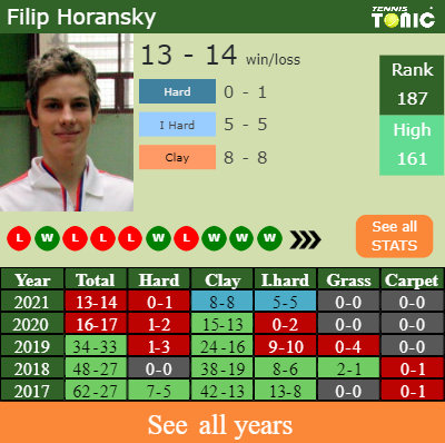 Horansky has a composed 13-14 win-loss record in 2021, 8-8 on clay (See FULL STATS).