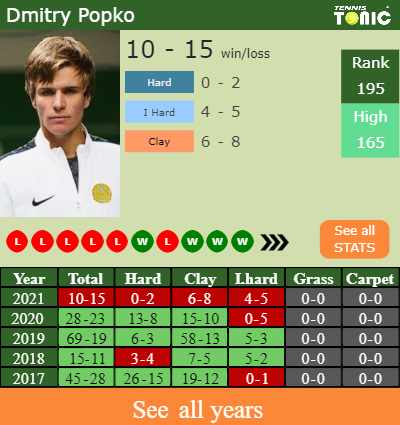 Popko has a solid win-loss record in the last 9 years having won 64% of his matches (341-188). 6-8 on clay in 2021. Regarding his performance on the same surface of this competition, Popko has a compiled200-95 win-loss record in the last 9 years on clay.