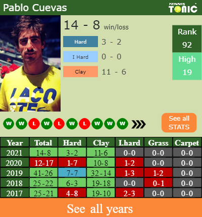 Cuevas has a winning match record in the last 10 years having won 59% of his matches (245-168). 11-6 on clay in 2021. In connection with his performance on the same surface of this competition, Cuevas has an aggregate 191-90 win-loss record in the last years on clay.