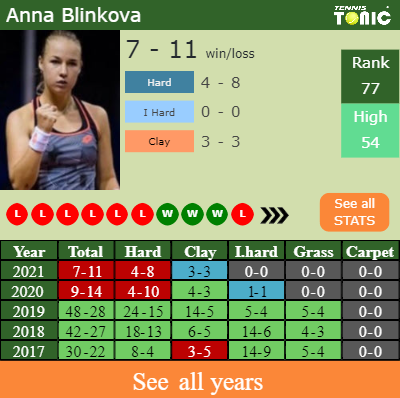 Anna has a composed 7-11 win-loss record in 2021, 0-0 on grass (See FULL STATS).