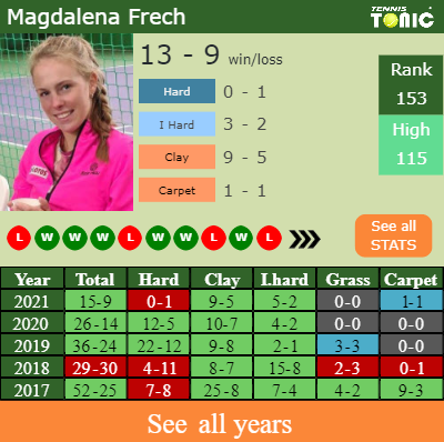 Frech has a compiled 15-9 win-loss record in 2021, 0-0 on grass (See FULL STATS).