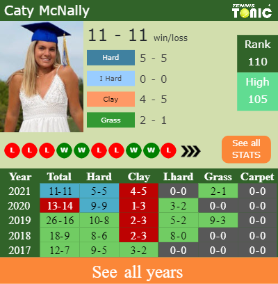 Talking about her overall career, McNally has an overall 85-62 record. She has a positive 11-5 record on grass.