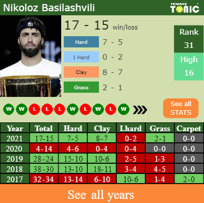 Nikoloz has an aggregate 17-15 win-loss record in 2021, 2-1 on grass (See FULL STATS).